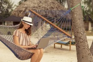 Female Freelancer Sitting In A Hammock Tied Up Between Palm Tree